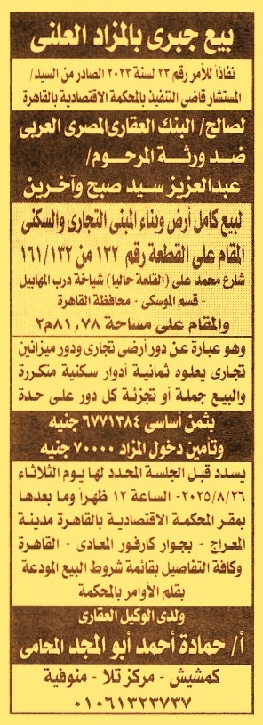 بيع كامل أرض وبناء المبنى التجاري والسكني المقام على قطعة رقم 132 من 132/161