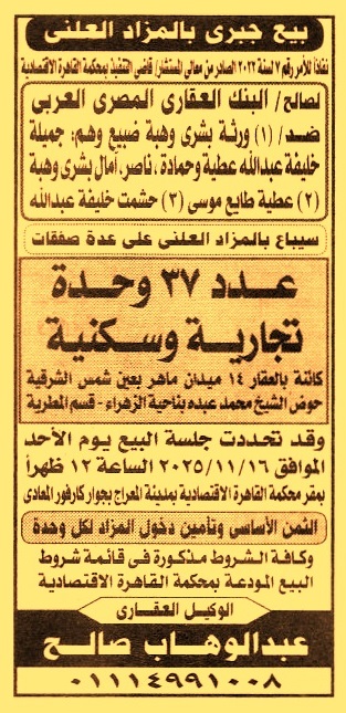 HOT Information مزايدة علنية لعملية بيع عدد 37 وحدة تجارية وسكنية كائنة بالعقار 14 ميدان ماهر – عين شمس الشرقية حوض الشيخ محمد عبده – ناحية الزهراء – قسم المطرية عن جريدة الأخبار Post navigation محافظة الأقصر مستشفى أحمد ماهر والجمهورية التعليمي