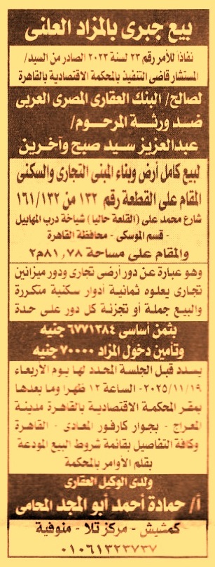 بيع كامل أرض وبناء المبنى التجاري والسكني المقام على قطعة رقم 132 من 132/161