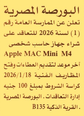 HOT Information ممارسة عامة رقم 1/2026 لعملية توريد جهاز حاسب شخصي Apple Mac Mini M4 عن جريدة الأهرام Post navigation معهد بحوث الإلكترونيات الهيئة العامة لنظافة وتجميل القاهرة
