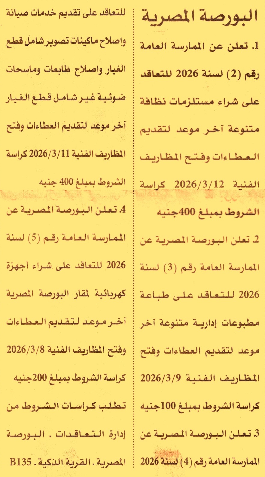 HOT Information ممارسة عامة رقم 2/2026 لعملية توريد مستلزمات نظافة عن جريدة الأهرام Post navigation جامعة القاهرة الشركة المصرية لتجارة الأدوية