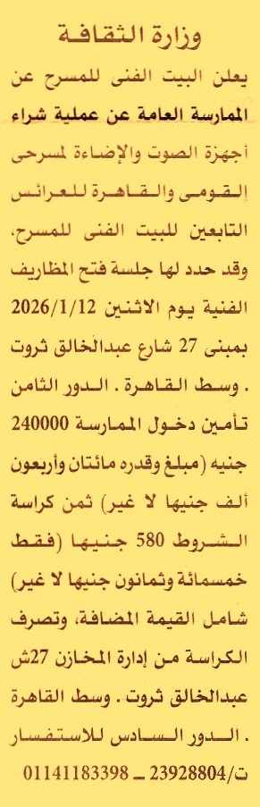 HOT Information ممارسة عامة لعملية توريد أجهزة الصوت والإضاء لمسرحي القومي والقاهرة للعرائس عن جريدة الأهرام Post navigation جمعية رسالة للأعمال الخيرية مركز أورام طنطا