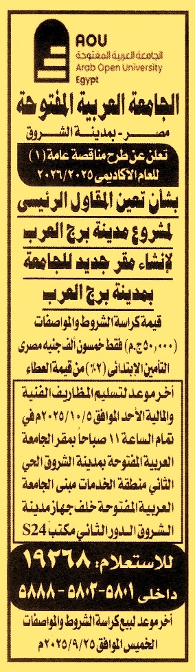 HOT Information مناقصة عامة رقم 1/2025/2026 لعملية تعين المقاول الرئيسي لمشروع مدينة برج العرب لإنشاء مقر جديد للجامعة بمدينة برج العرب (أخر موعد لبيع الكراسة يوم 25/9/2025) عن جريدة الأهرام Post navigation رئاسة حي المقطم الإتحاد التعاوني الزراعي