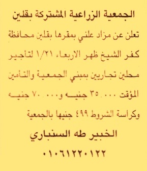 HOT information مزايدة علنية لعملية تأجير محلين تجاريين بمبنى الجمعية (1) المحل رقم 1 (2) المحل رقم 2 عن جريدة الجمهورية Post navigation محافظة قنا محافظة الوادي الجديد