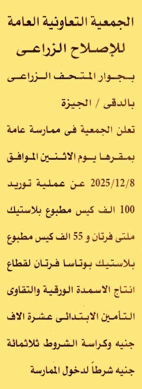 HOT Information ممارسة عامة لعملية توريد 100 ألف كيس مطبوع بلاستيك ملتي فرتان و55 ألف كيس مطبوع بلاستيك بوتاسا فرتان لقطاع انتاج الأسمدة الورقية والتقاوي عن جريدة الأهرام Post navigation شركة مطاحن مصر الوسطى شركة غرب الدلتا لإنتاج الكهرباء