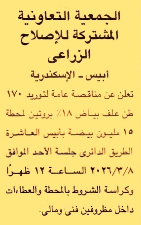 HOT Information مناقصة عامة لعملية توريد 170 طن علف بياض 18% بروتين لمحطة إنتاج 15 مليون بيضة بأبيس العاشر عن جريدة الجمهورية Post navigation مركز التنمية الشبابية بمدينة السادات بالمنوفية شركة الاسكندرية لتوزيع الكهرباء