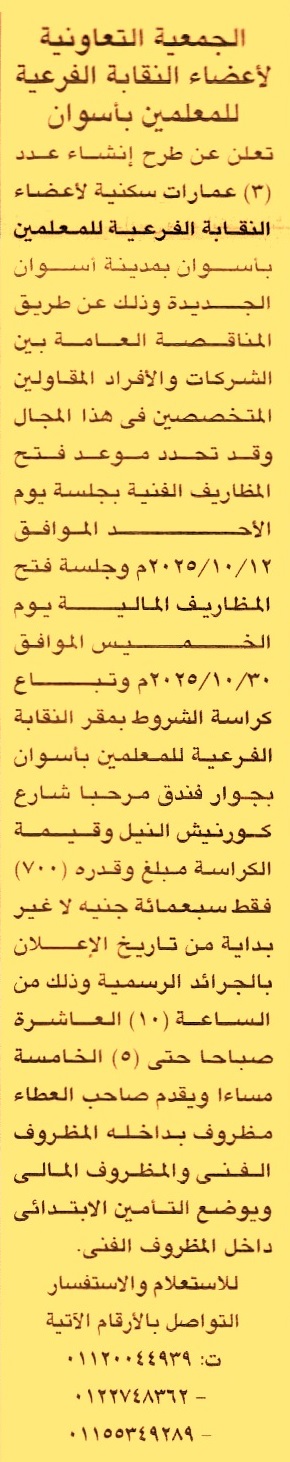 إنشاء عدد 3 عمارات سكنية لأعضاء النقابة بمدينة أسوان الجديدة
