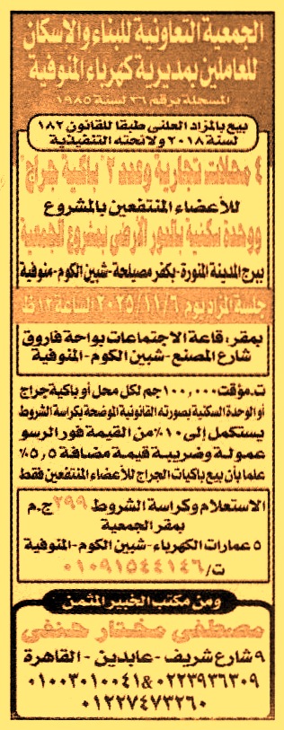 بيع عدد 4 محلات تجارية عدد 2 باكية جراج للأعضاء المنتفعين بالمشروع
