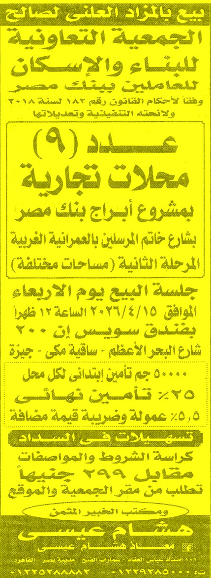 جلسة البيع يوم الأربعاء الموافق 15/4/2026 بفندق سويس إن 200 شارع البحر الأعظم – ساقية مكي – الجيزة