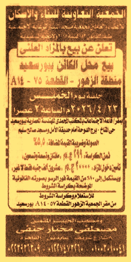 بيع محل الكائن ببورسعيد منطقة الزهور – القطعة 75 – A14