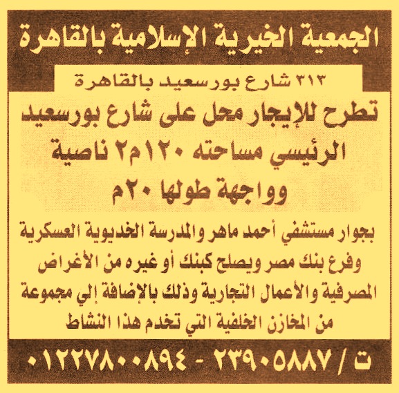 بجوار مستشفى أحمد ماهر والمدرسة الخديوية العسكرية وفرع بنك مصر
