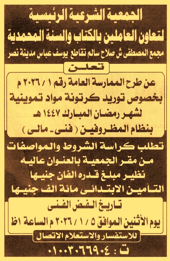HOT Information ممارسة عامة رقم 1/2026 لعملية توريد كرتونة مواد تموينية لشهر رمضان المبارك 1447 هـ عن جريدة الأهرام Post navigation جمعية شروق مصر للقروض متناهية الصغر وزارة الصحة والسكان