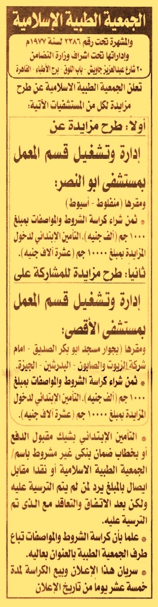 HOT Information مزايدة عامة لعملية إدارة وتشغيل قسم المعمل بمستشفى أبو النصر ومقرها منفلوط – أسيوط (مدة سريان الإعلان وبيع الكراسات 15 يوم من تاريخ الإعلان) عن جريدة الأخبار Post navigation النقابة الفرعية للمعلمين بالمنيا وزارة الاتصالات وتكنولوجيا المعلومات