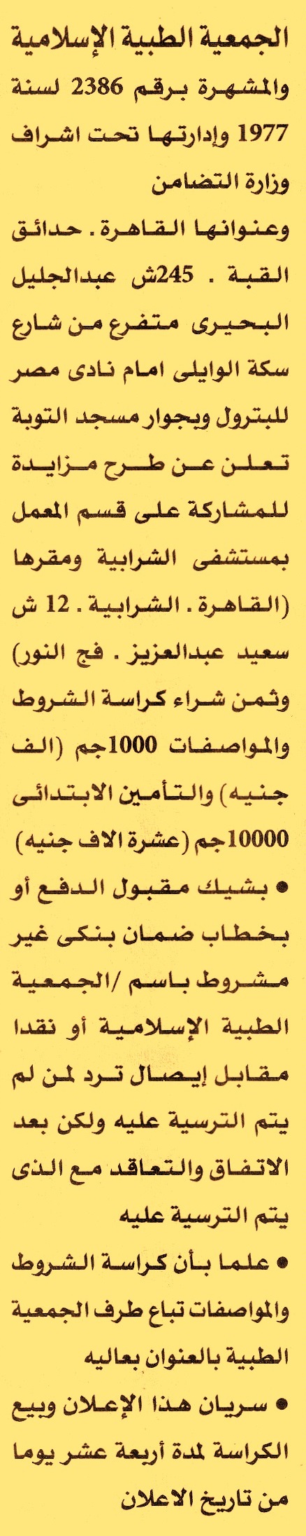 HOT information مزايدة عامة لعملية المشاركة على قسم المعمل بمستشفى الشرابية ومقرها القاهرة – الشرابية – 12 ش سعيد عبد العزيز – فج النور (مدة سريان الإعلان وبيع الكراسات 14 يوم من تاريخ الإعلان) عن جريدة الأهرام Post navigation مكتب النائب العام مركز شباب بيبان بكوم حمادة