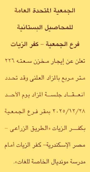 HOT Information مزايدة علنية لعملية تأجير مخزن بمساحة 226م2 عن جريدة الجمهورية Post navigation مركز شباب التوفيقية بدمياط الجمعية العامة للمعاهد القومية