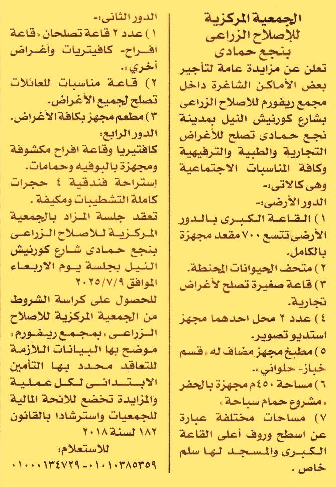 تأجير بعض الأماكن الشاغرة داخل مجمع ريفورم للإصلاح الزراعي