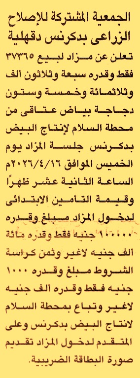 HOT information مزايدة عامة لعملية بيع 37365 دجاجة بياض عتاقي من محطة السلام لإنتاج البيض بدركنس عن جريدة الجمهورية Post navigation مركز كفر العزيزية بسمنود شركة مياه الشرب والصرف الصحي بدمياط