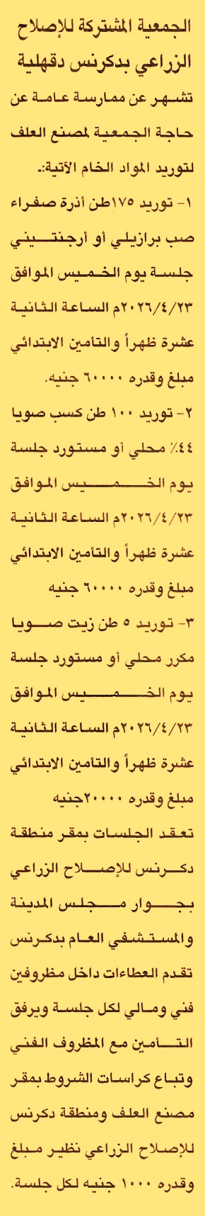 HOT Information ممارسة عامة لعملية توريد المواد الخام الأتية (1) 175 طن أذرة صفراء صب برازيلي أو أرجنتيني (2) 100 طن كسب صويا 44% محلي أو مستورد (3) 5 طن زيت صويا مكرر محلي أو مستورد لمصنع العلف عن جريدة الجمهورية Post navigation شركة مياه الشرب والصرف الصحي بالمنيا مستشفى الشروق المركزي