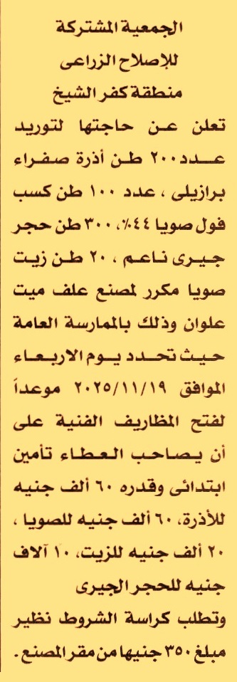HOT Information ممارسة عامة لعملية توريد الأتي (1) 200 طن أذرة صفراء برازيلي (2) 100 طن كسب فول صويا 44% (3) 300 طن حجر جيري ناعم (4) 20 طن زيت صويا مكرر لمصنع علف ميت علوان عن جريدة الأخبار Post navigation جامعة الفيوم مجلس الدولة