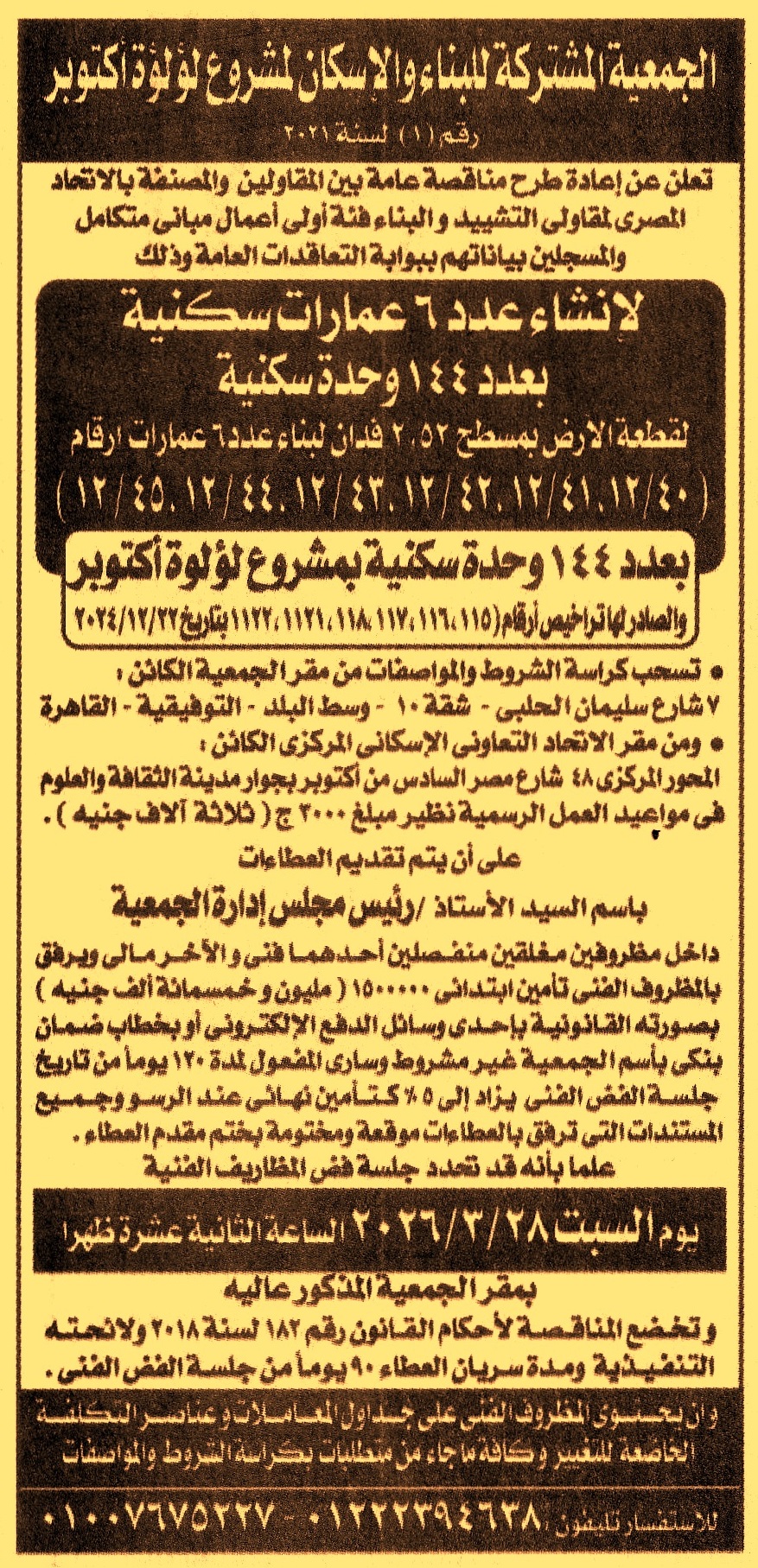 HOT Information إعادة مناقصة عامة لعملية إنشاء عدد 6 عمارة سكنية بعدد 144 وحدة سكنية لقطعة الأرض بمساحة 2.52 فدان بمشروع الجمعية الكائن بمدينة سوهاج الجديدة (مدة سريان خطاب الضمان 4 أشهر ومدة سريان العطاءات 3 أشهر) عن جريدة الجمهورية Post navigation الهيئة العامة للاستثمار والمناطق الحرة مركز شباب عزبة الجندي بقليوب