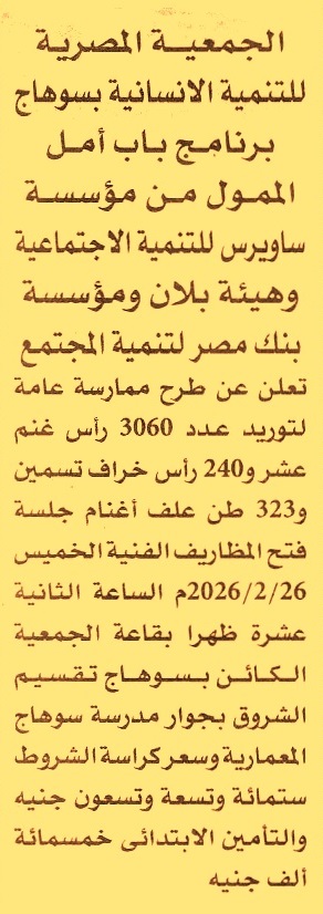 HOT information ممارسة عامة لعملية توريد عدد 3060 رأس غنم عشر و240 رأس خراف تسمين و323 طن علف أغنام والعملية تابعة لبرنامج باب أمل الممول من مؤسسة ساويرس للتنمية الاجتماعية وهيئة بلان انترناشونال ومؤسسة بنك مصر لتنمية المجتمع عن جريدة الأهرام Post navigation الجامعة المصرية اليابانية للعلوم والتكنولوجيا ببرج العرب المؤسسة القومية لتنمية الأسرة والمجتمع