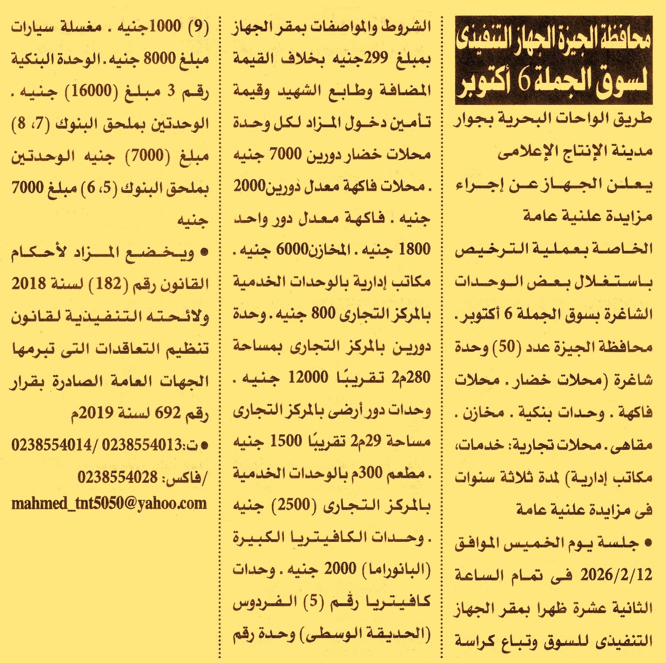 HOT Information مزايدة علنية عامة لعملية الترخيص باستغلال بعض الوحدات الشاغرة بسوق الجملة 6 أكتوبر عدد 50 وحدة شاغرة “محلات خضار, محلات فاكهة, وحدات بنكية, مخازن, مقاهي, محلات تجارية, خدمات, مكاتب إدارية” لمدة 3 سنوات عن جريدة الأهرام Post navigation الشركة المصرية للثروات التعدينية مركز شباب ميت العطار