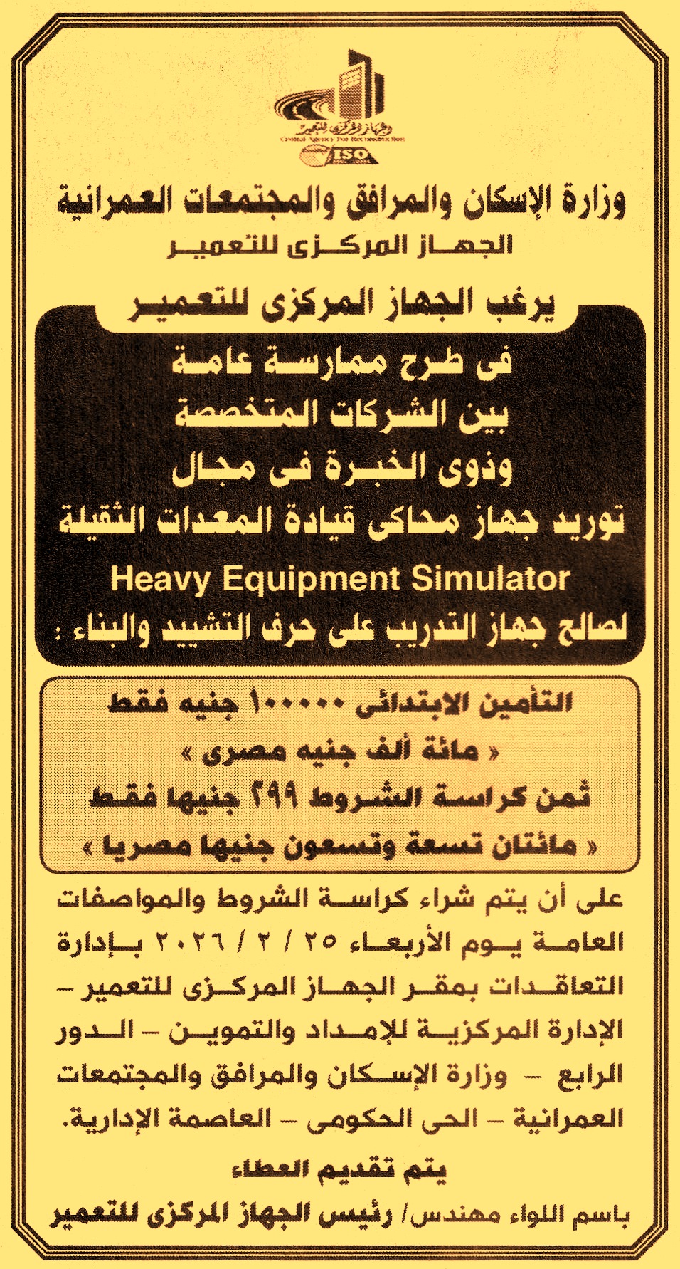 HOT Information ممارسة عامة لعملية توريد جهاز محاكي قيادة المعدات الثقيلة لصالح جهاز التدريب على حرف التشييد والبناء عن جريدة الأهرام Post navigation الهيئة العامة لشئون المطابع الأميرية جامعة القاهرة