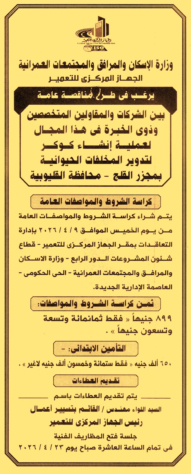 HOT Information ممارسة عامة لعملية إنشاء كوكر لتدوير المخلفات الحيوانية بمجزر القلج – محافظة القليوبية (تباع الكراسة من يوم 9/4/2026) عن جريدة الأهرام Post navigation محافظة البحيرة النقابة العامة لأطباء مصر