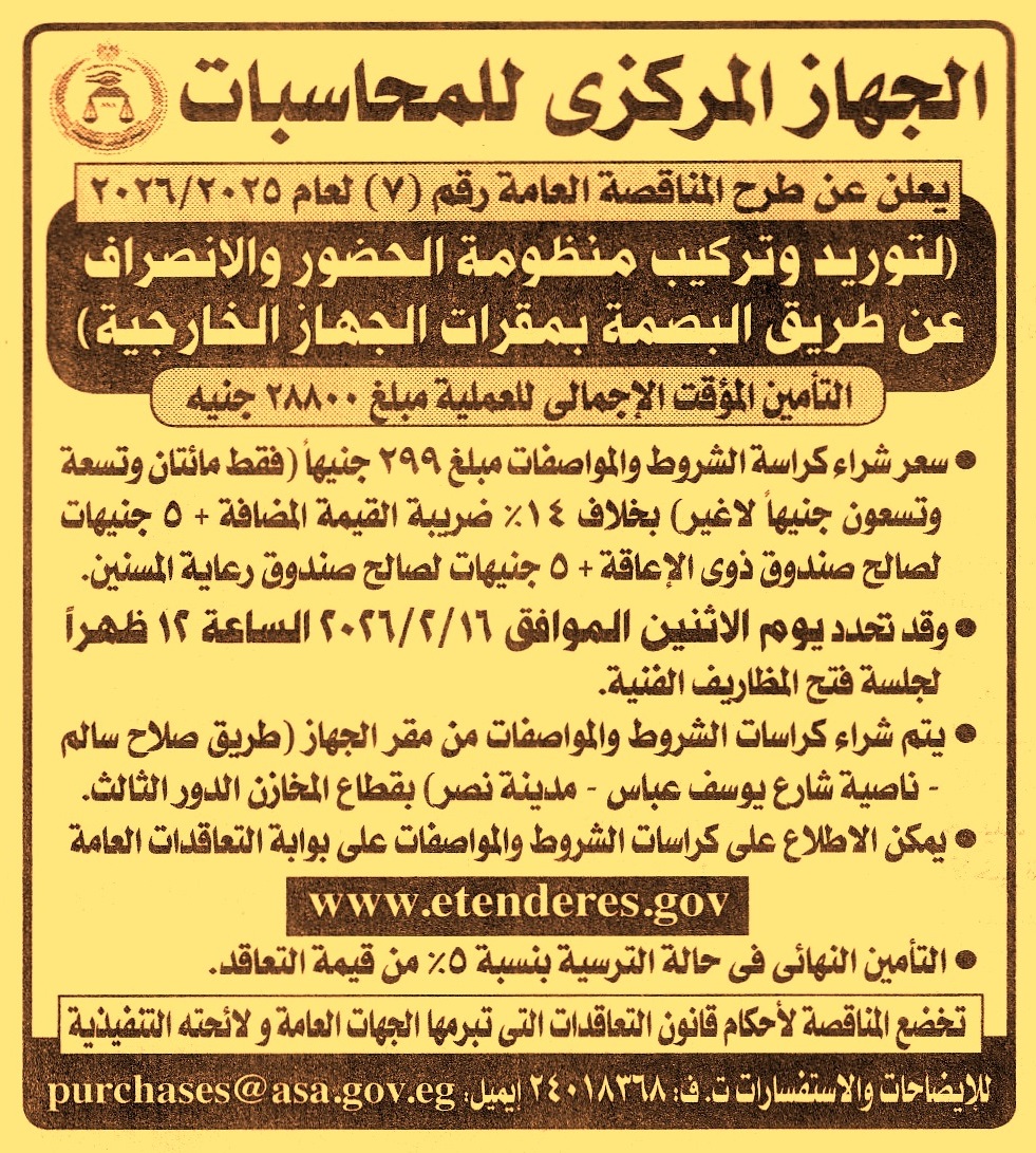 HOT Information مناقصة عامة رقم 7/2025/2026 لعملية توريد وتركيب منظومة الحضور والانصراف عن طريق البصمة بمقرات الجهاز الخارجية عن جريدة الأخبار Post navigation بنك فيصل الإسلامي المصري جامعة مدينة السادات