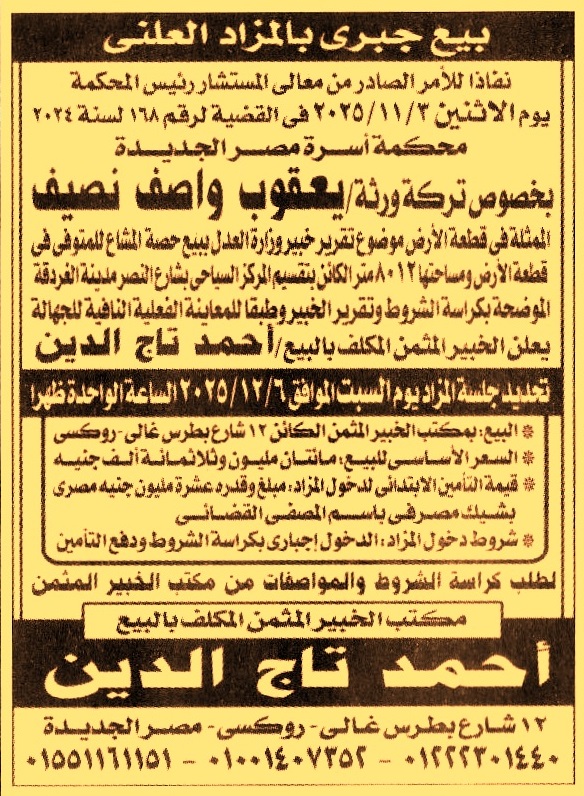 HOT Information مزايدة علنية لعملية بيع حصة مشاع في قطعة أرض بمساحة 8012م الكائن بتقسيم المركز السياحي بشارع النصر – مدينة الغردقة بسعر أساسي 200.300.000ج عن جريدة الجمهورية Post navigation نادي دكرنس الرياضي بالدقهلية محافظة الدقهلية