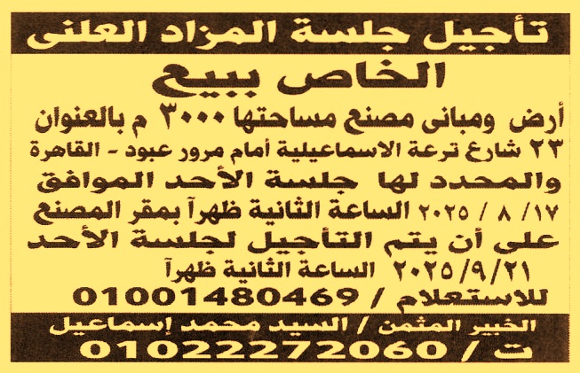 يعلن عن تأجيل جلسة المزايدة العلنية لعملية