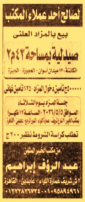 HOT Information مزايدة علنية لعملية بيع صيدلية بمساحة 43م2 كائنة بـ 17 ميدان أسوان – العجوزة – الجيزة عن جريدة الجمهورية Post navigation مركز شباب السلام بالسويس شركة مياه الشرب والصرف الصحي بدمياط