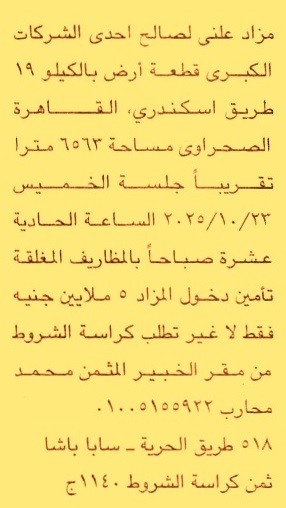 HOT Information مزايدة علنية لعملية بيع قطعة أرض بمساحة 6563م تقريبا بالكيلو 19 طريق الإسكندرية/ القاهرة الصحراوي عن جريدة الجمهورية Post navigation نادي الشباب بطوخ EGYPTIAN ELECTRICITY TRANSMISSION COMPANY (EETC)