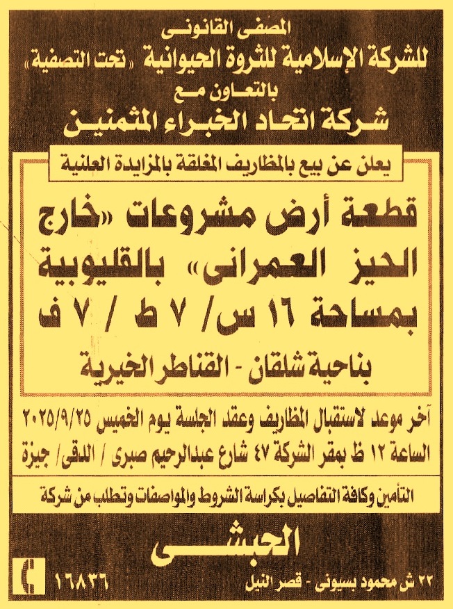HOT information مزايدة علنية لعملية بيع قطعة أرض مشروعات “خارج الحيز العمراني” بالقليوبية بمساحة 16س 7ط 7ف بناحية شلقان – القناطر الخيرية عن جريدة الأخبار Post navigation دار القوات البحرية المحروسة بالإسكندرية محافظة سوهاج