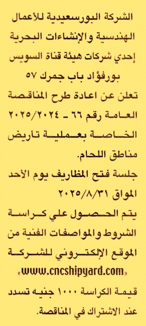 HOT Information إعادة مناقصة عامة رقم 66/2024/2025 لعملية تأريض مناطق اللحام بالشركة عن جريدة الجمهورية Post navigation الإدارة العامة لصرف بني سويف مركز البحوث الزراعية