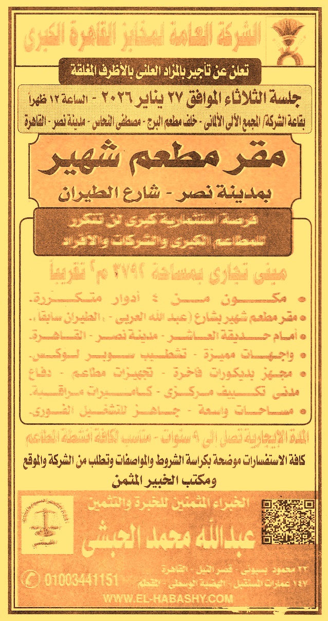 HOT Information مزايدة علنية لعملية تأجير مقر مطعم شهير بمدينة نصر – شارع الطيران مبنى تجاري بمساحة 3792م2 تقريبا لمدة تصل إلى 9 سنوات عن جريدة الأخبار Post navigation الشركة العامة لإستصلاح الأراضي والتنمية العمرانية الشركة المصرية لمدينة الإنتاج الإعلامي