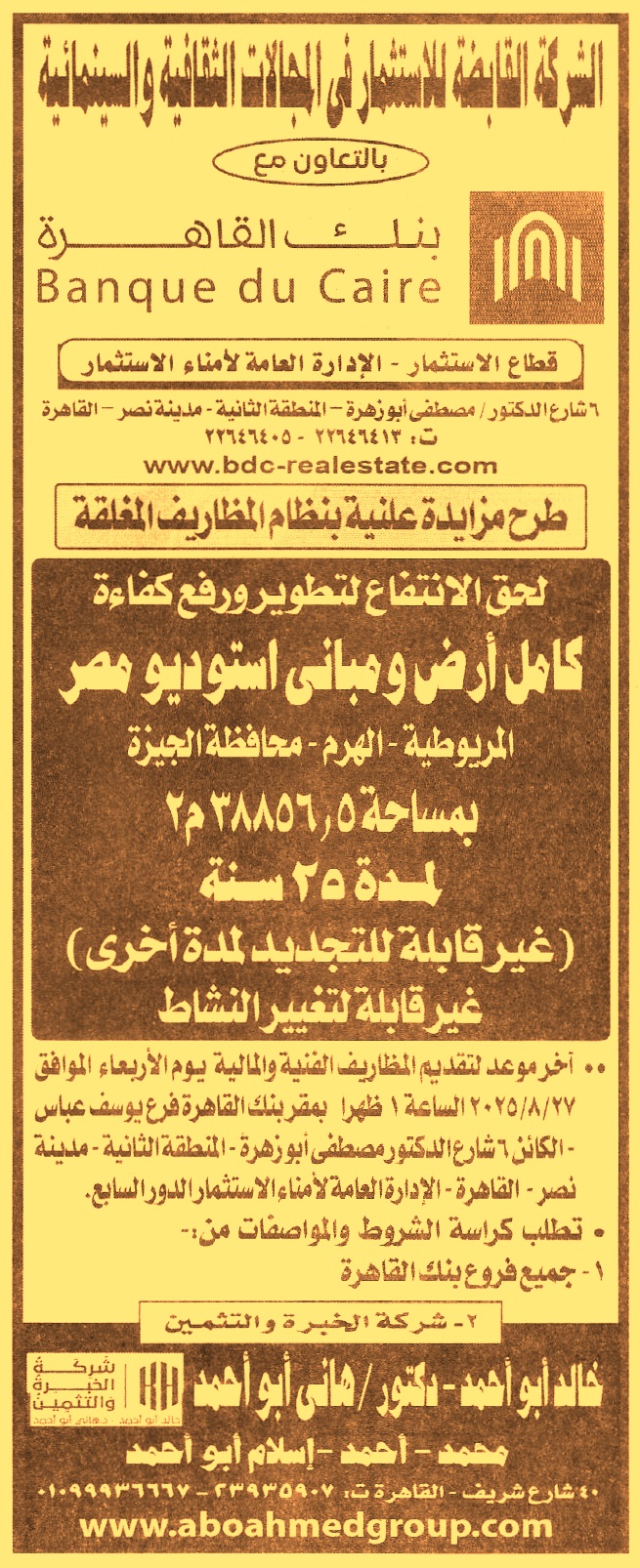 HOT Information مزايدة علنية لعملية حق الإنتفاع لتطوير ورفع كفاءة كامل أرض ومباني استوديو مصر بمساحة 38856.5م2 بالمريوطية – الهرم – محافظة الجيزة لمدة 25 سنة غير قابلة للتجديد لمدة أخرى وغير قابلة لتغيير النشاط عن جريدة الأهرام Post navigation مركز تحديث الصناعة شركة ميناء القاهرة الجوي