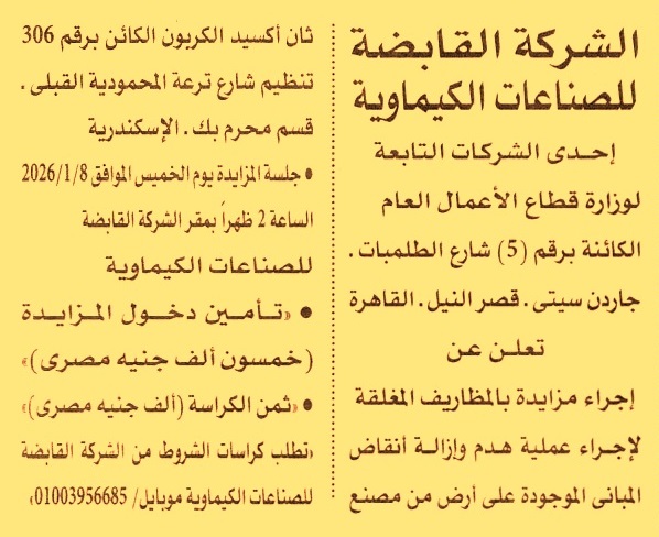 HOT Information مزايدة عامة لعملية هدم وإزالة أنقاض المباني الموجودة على أرض من مصنع ثان أكسيد الكربون الكائن برقم 306 تنظيم شارع ترعة المحمودية القبلي – قسم محرم بك – الإسكندرية عن جريدة الأهرام Post navigation شركة النيل للبترول جمعية شروق مصر للقروض متناهية الصغر