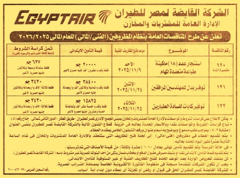 HOT information مناقصة عامة رقم 120/2025/2026 لعملية استئجار عدد 18 ماكينة طباعة متعددة المهام (للشركة الحق في قبول أو رفض أو تجزئة أي عطاء بدون إبداء الأسباب) عن جريدة الأهرام Post navigation مستشفى الأطفال بجامعة المنصورة شركة مصر للطيران للخطوط الجوية