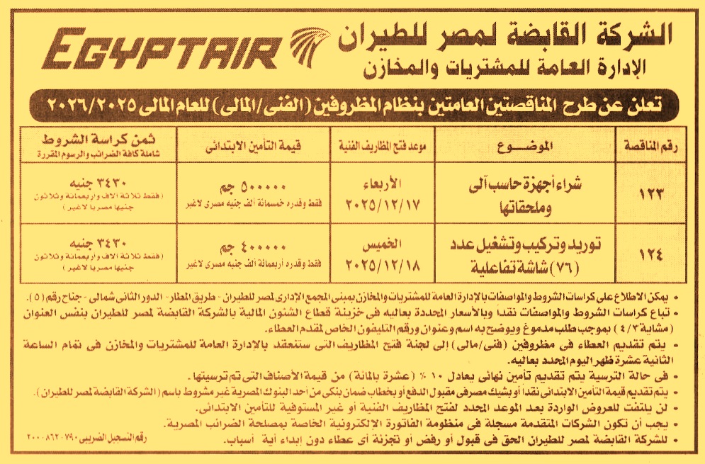 HOT information مناقصة عامة رقم 123/2025/2026 لعملية توريد أجهزة حاسب ألي وملحقاتها (للشركة الحق في قبول أو رفض أو تجزئة أي عطاء بدون إبداء الأسباب) عن جريدة الأهرام Post navigation شركة مصر لإدارة الأصول العقارية شركة كولدويل بانكر