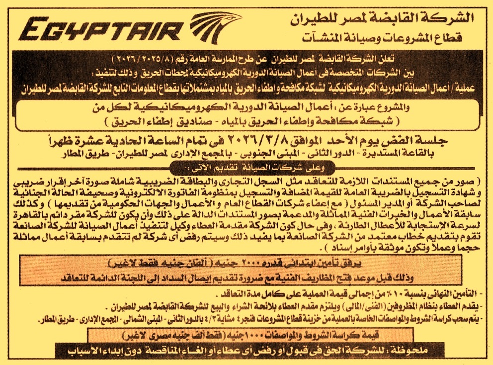 وعلى أن يكون للشركة مقر دائم بالقاهرة لسرعة الاستجابة للأعطال الطارئة