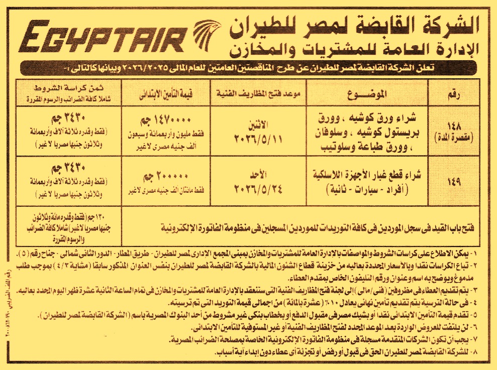 HOT information مناقصة عامة رقم 148/2025/2026 لعملية توريد ورق كوشيه وورق بريستول كوشيه وسلوفان وورق طباعة وسلوتيب (للشركة الحق في قبول أو رفض أو تجزئة أي عطاء بدون إبداء الأسباب) عن جريدة الأهرام Post navigation شركة البتروكيماويات المصرية فرصة استثمارية بقلب بورصة القاهرة الكبرى