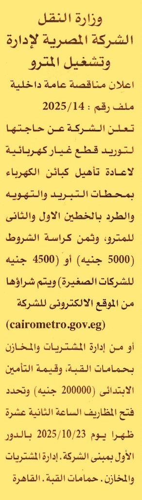 HOT Information مناقصة داخلية عامة رقم 14/2025 لعملية توريد قطع غيار كهربائية لإعادة تأهيل كبائن الكهرباء بمحطات التبريد والتهوية والطرد بالخطين الأول والثاني للمترو (تباع الكراسة بسعر 4.500ج للمنشأت الصغيرة) عن جريدة الأهرام Post navigation شركة سيناء للمنجنيز محافظة أسيوط