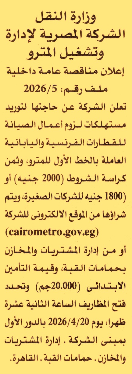 HOT Information مناقصة داخلية عامة رقم 5/2026 لعملية توريد مستهلكات لزوم أعمال الصيانة للقطارات الفرنسية واليابانية العاملية بالخط الأول للمترو (تباع الكراسة بسعر 1.800ج للمنشأت الصغيرة) عن جريدة الأهرام Post navigation نادي هليوبوليس الرياضي المعمل المركزي لتحليل متبقيات المبيدات