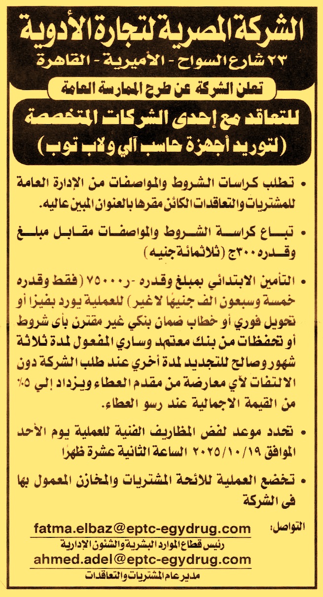 HOT information ممارسة عامة لعملية توريد أجهزة حاسب ألي ولاب توب (مدة سريان خطاب الضمان 3 أشهر وصالح للتجديد لمدة أخرى) عن جريدة الأهرام Post navigation الوحدة المحلية لمركز ومدينة القنطرة غرب الشركة المصرية للمطارات