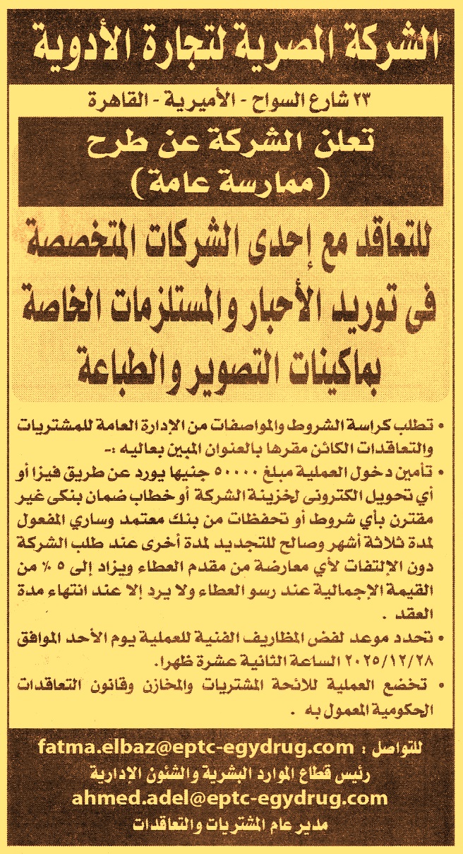 HOT Information ممارسة عامة لعملية توريد الأحبار والمستلزمات الخاصة بماكينات التصوير والطباعة (مدة سريان خطاب الضمان 3 أشهر وصالح للتجديد لمدة أخرى) عن جريدة الأهرام Post navigation شركة السويس لتصنيع البترول جمعية أيادي 4040