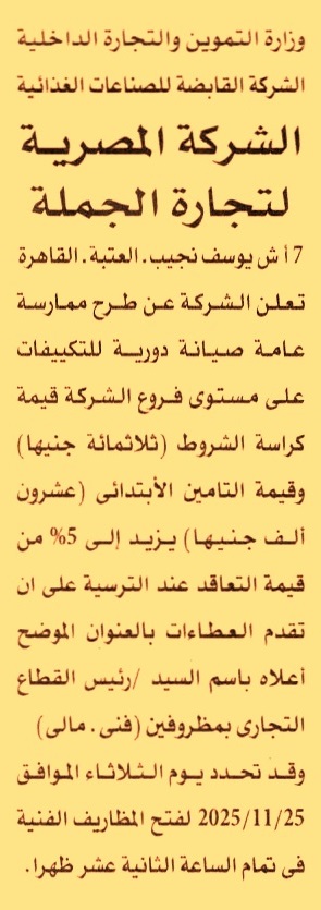 HOT Information ممارسة عامة لعملية تنفيذ أعمال صيانة دورية للتكييفات على مستوى فروع الشركة عن جريدة الأهرام Post navigation الشركة المصرية لتجارة الجملة بنك الاستثمار العربي