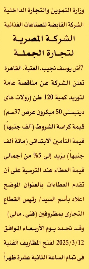 HOT Information مناقصة عامة لعملية توريد كمية 120 طن رولات هاي دينيستي 50 ميكرون عرض 37 سم عن جريدة الأهرام Post navigation شركة مصر العامرية للغزل والنسيج وزارة التعليم العالي