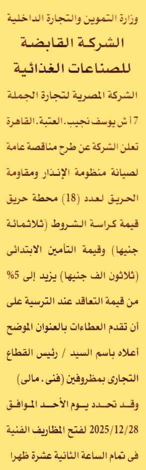HOT information مناقصة عامة لعملية صيانة منظومة الإنذار ومقاومة الحريق لعدد 18 محطة حريق عن جريدة الأهرام Post navigation اتحاد شاغلي قرية جرين بيتش جامعة القاهرة