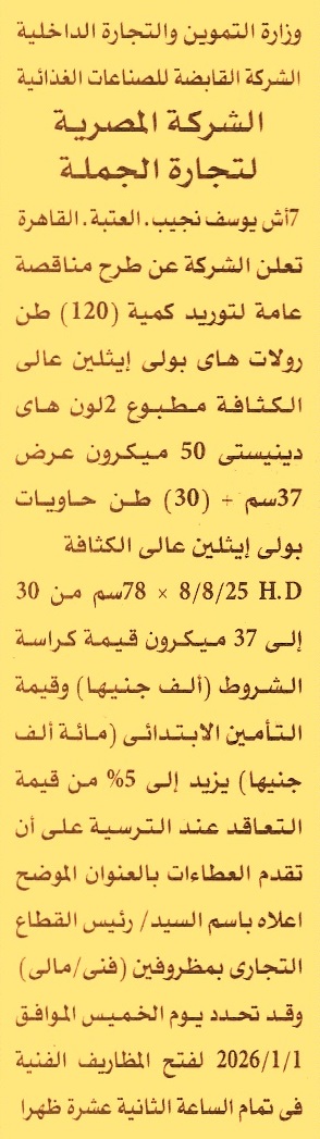 توريد كمية 120 طن رولات هاي بولي إيثيلين عالي الكثافة